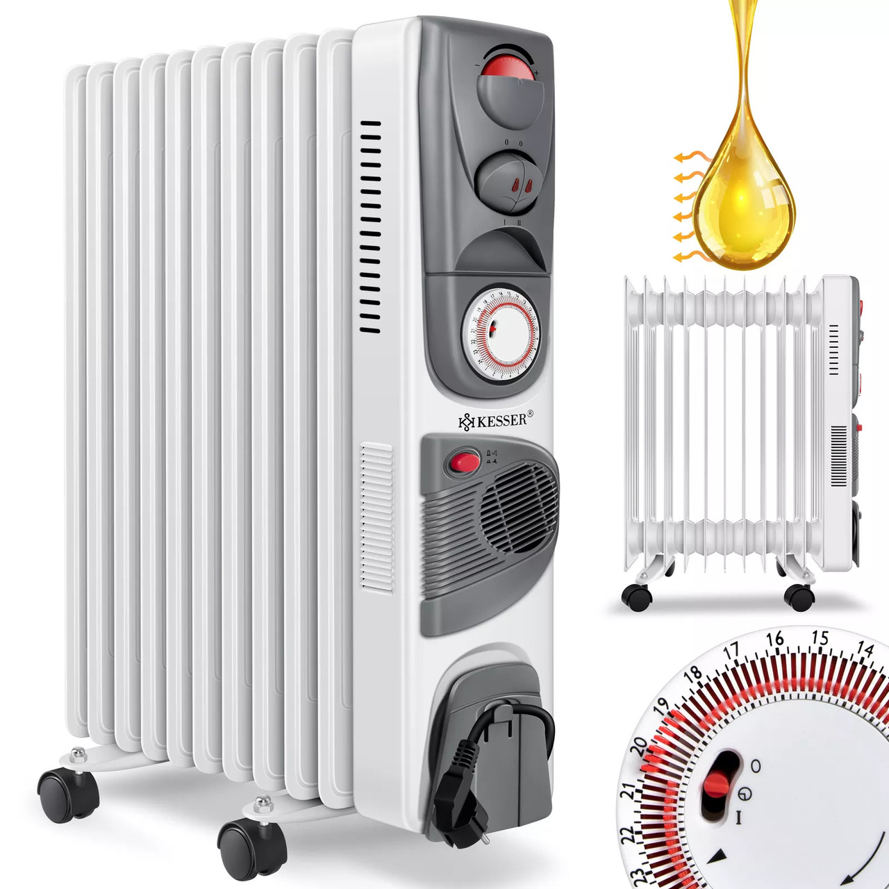 Масляний електричний обігрівач з таймером KESSER 2500 Вт з 11 ребрами та з вентилятором 2500W Німеччина