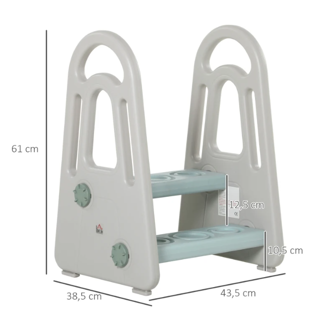 З цією дитячою сходинкою від HOMCOM ваша дитина може легко та безпечно досліджувати дім. Незалежно від того, чи миєте ви руки, чи йдете в туалет, цей табурет-сходинка забезпечує безпеку вашої дитини та надійне утримання, коли вона вивчає гігієну, досліджує навколишнє середовище або працює самостійно. Нековзні ручки ідеально підходять для маленьких дитячих ручок. Захистіть себе від падінь і допоможіть зробити перші кроки до незалежності.опис: ✔ Стійка трикутна конструкція для високої стабільності ✔ Нековзні ручки надійно тримають вашу дитину ✔ Підходить для ванної, спальні та кухні ✔ 4 гумові ніжки запобігають небажаному ковзанню ✔ Завдяки невеликій вазі в 2,3 кг ваша дитина може легко штовхати або рухати його ✔ Виготовлений з матеріалу HDPE та PP ✔ Підходить для дітей від 2 до 5 років ✔ Рекомендується використовувати дитячий стілець під наглядом дорослого ✔ Потрібна проста збіркаТехнічні характеристики: ✔ Колір: синій+сірий ✔ Матеріал: HDPE, PP ✔ Габаритні розміри: 43,5 Д x 38,5 Ш x 61 В см ✔ Розміри на ярус: 36,6 Д x 14,5 Ш x 4 В см ✔ Висота ступенів: 10,5 см, 23 см ✔ Вантажопідйомність: 25 кг Обсяг поставки: ✔ 1 х дитячий стільчик ✔ 1*Інструкції -