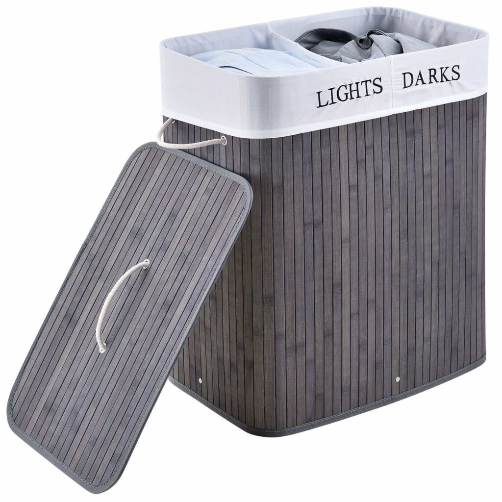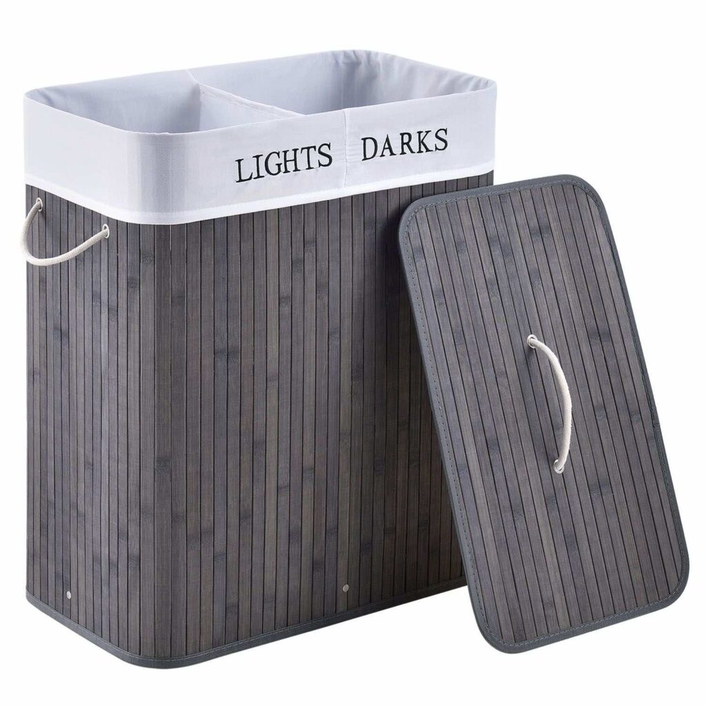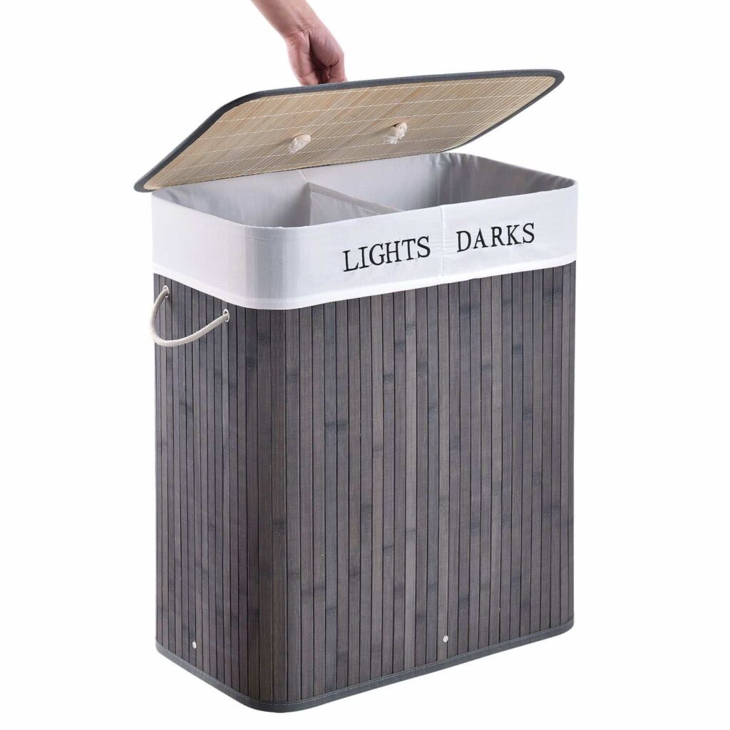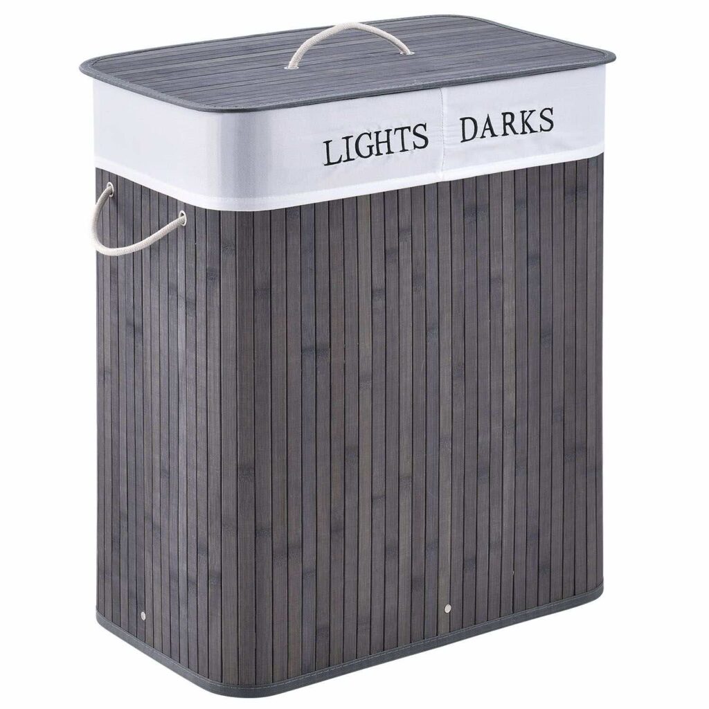 У фігурному бамбуковому кошику для білизни з кришкою (100 л, сіра) білизна залишається акуратною, непомітною і захищеною від запахів. Кошик розміром 52×32 см має достатньо місця для зберігання – ідеально підходить для сім’ї. У двох відділеннях ви поділяєте одяг на кольоровий та білий, що згодом економить багато часу! Надійний кошик можна розмістити в спальні або дитячій кімнаті, наприклад, або поруч із шафою, ванною або в кутку ванної кімнати. Знімний мішок для білизни забезпечує гігієнічне зберігання шкарпеток або спідньої білизни. Кошик білизни замикається і може бути легко піднесений до пральної машини однією рукою.