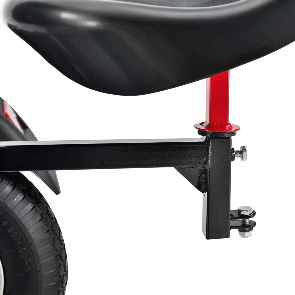 Карт оснащений міцною рамою із металу з порошковим покриттям. Це означає, що переднє сидіння має максимальну вантажопідйомність до 80 кг. Тому він також підходить для дорослих, які хотіли б покататися на педальному автомобілі. На заднє сидіння можна завантажити до 25 кг.