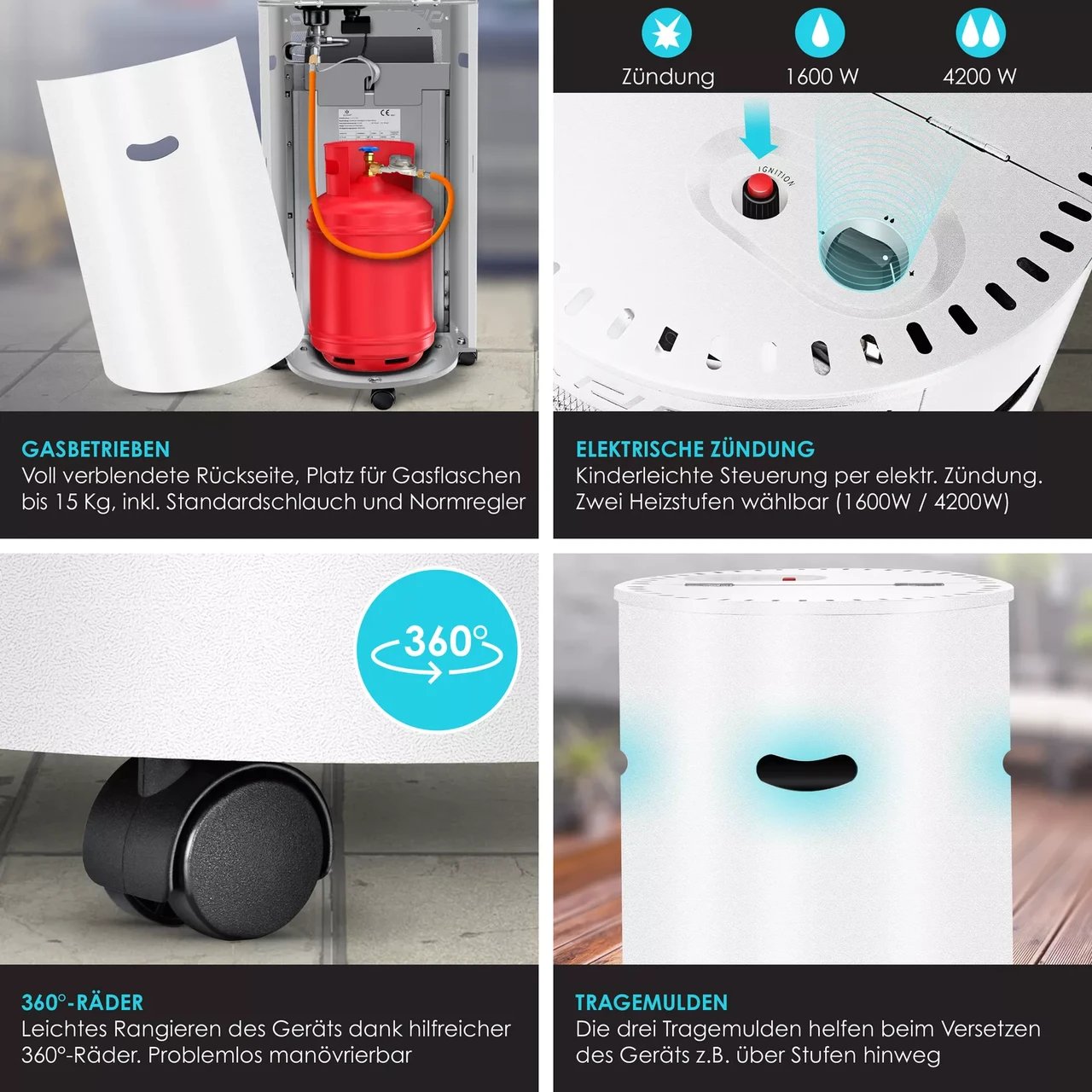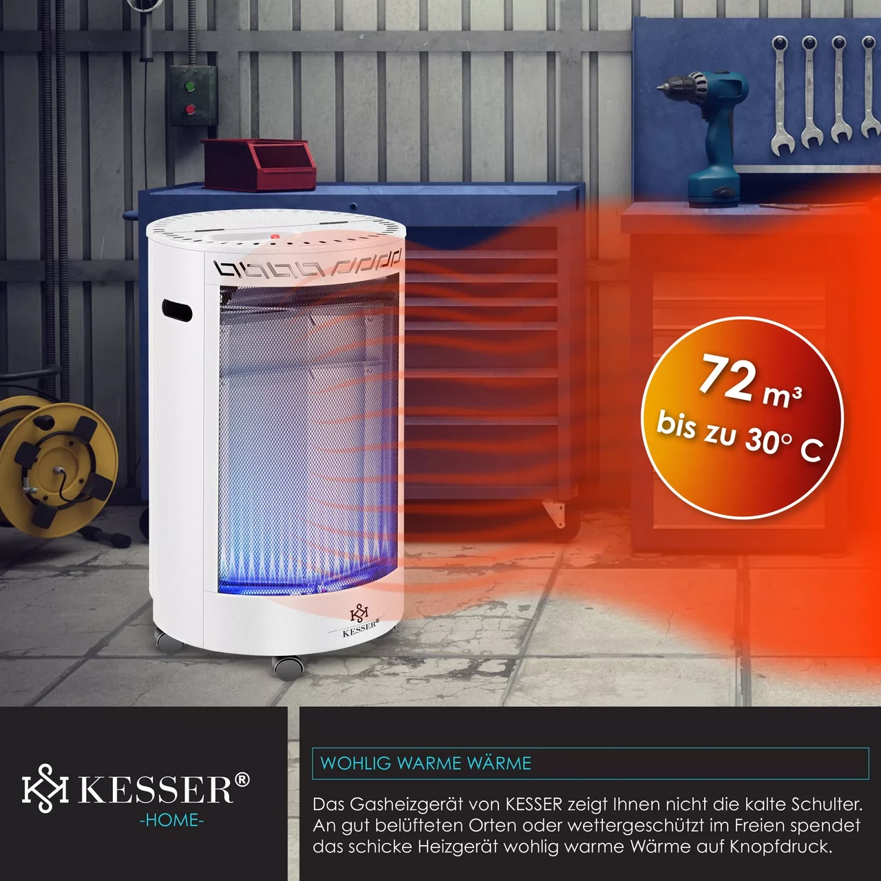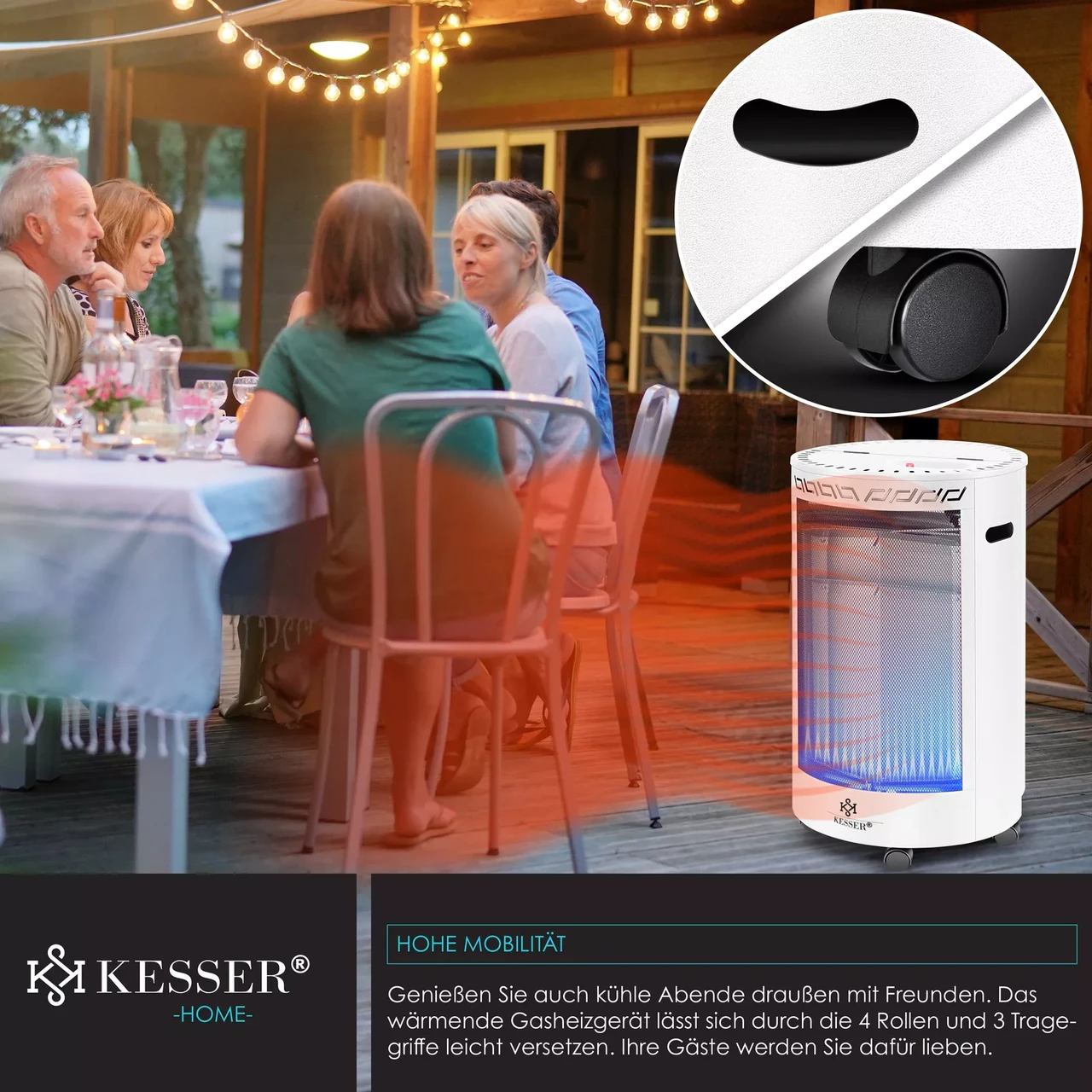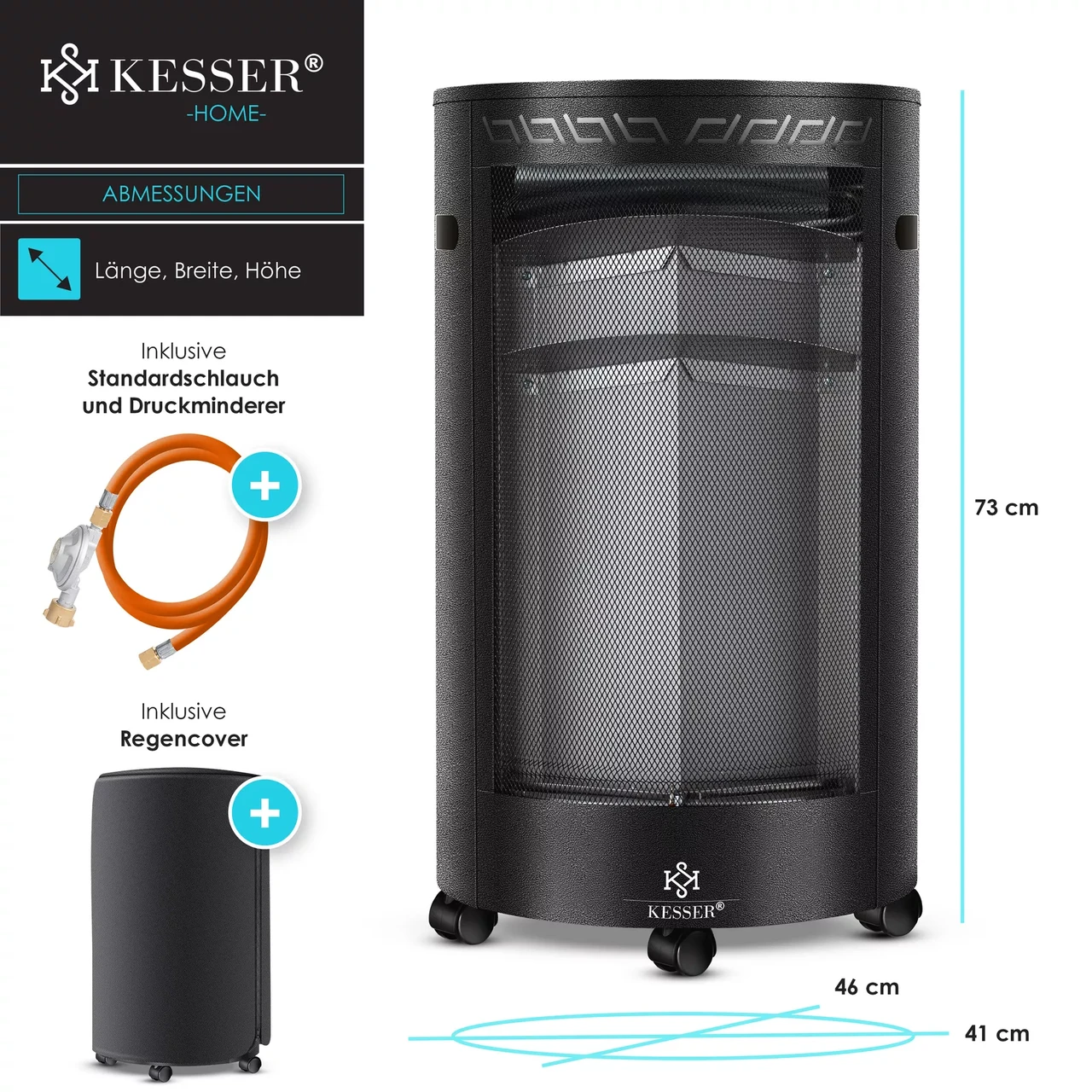 Газовий обігрівач KESSER круглий – елегантний дизайн, два режими нагріву, природне тепло, повне закриття балона, електричне розпалювання, в комплекті стандартний шланг, захисний чохол від дощу, 3 зручні ручки для перенесення та колеса з поворотом на 360 °
