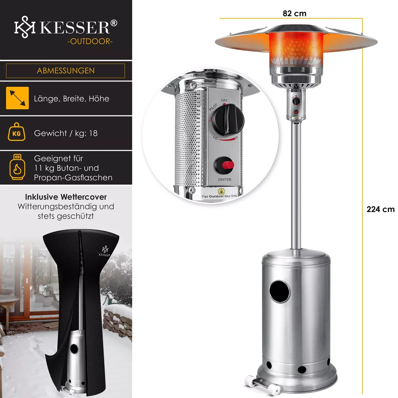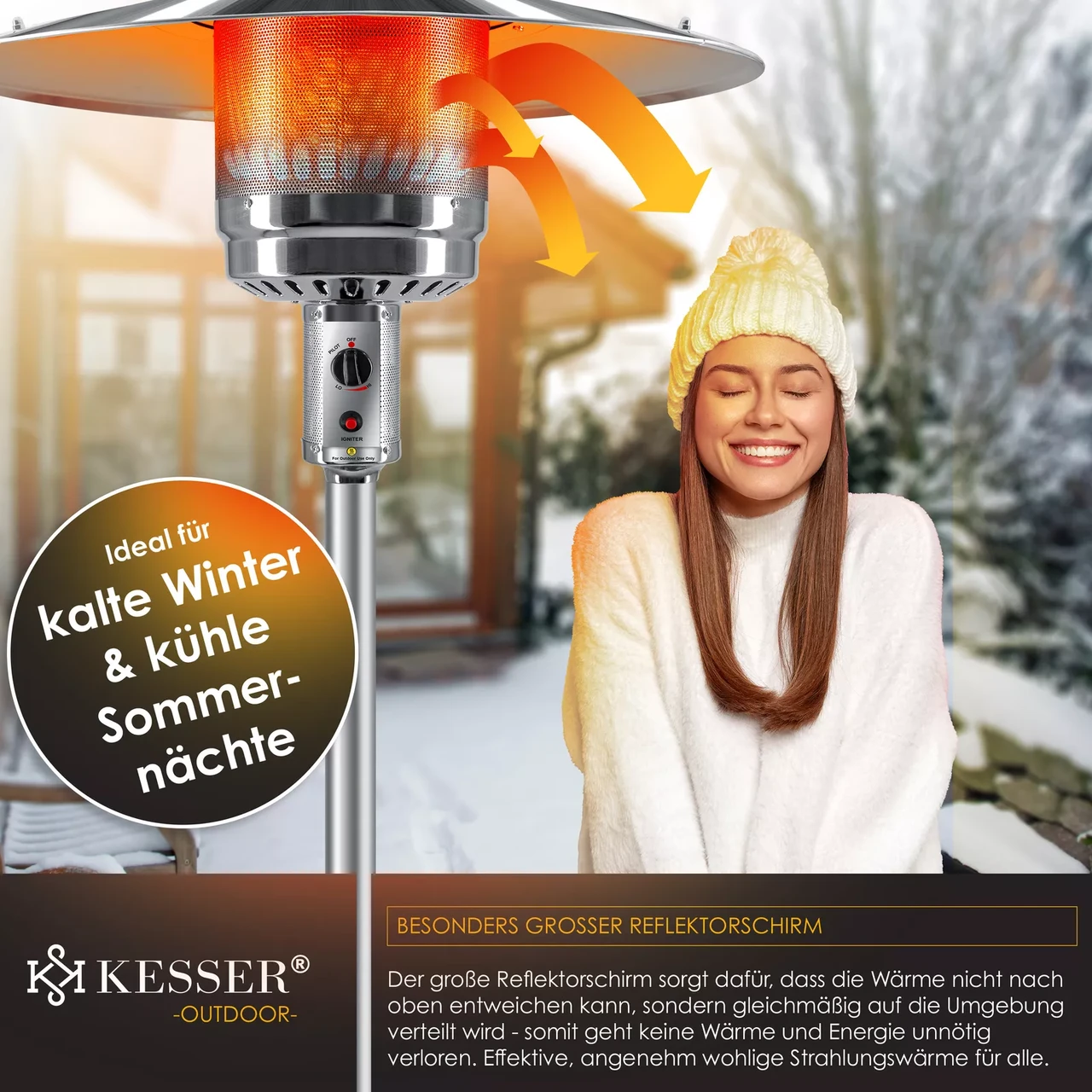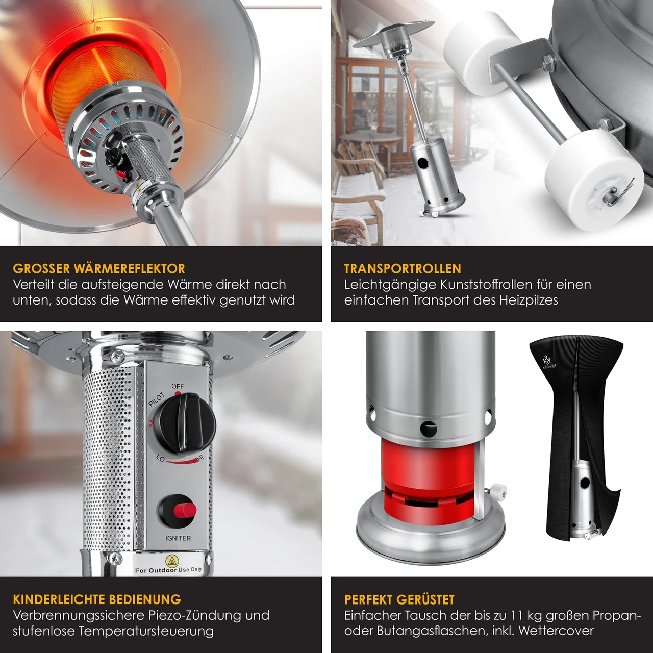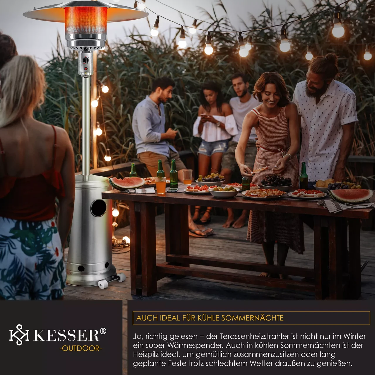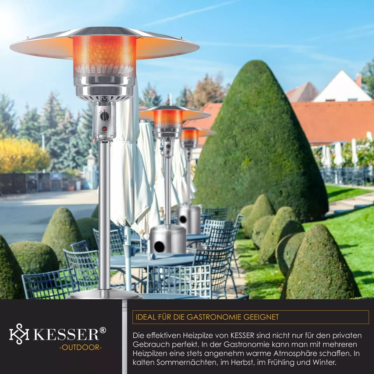 Газовий обігрівач для патіо від KESSER для комфортного тепла в неопалюваних місцях, таких як сади, ресторани, тераси, вечірні намети та балкони.