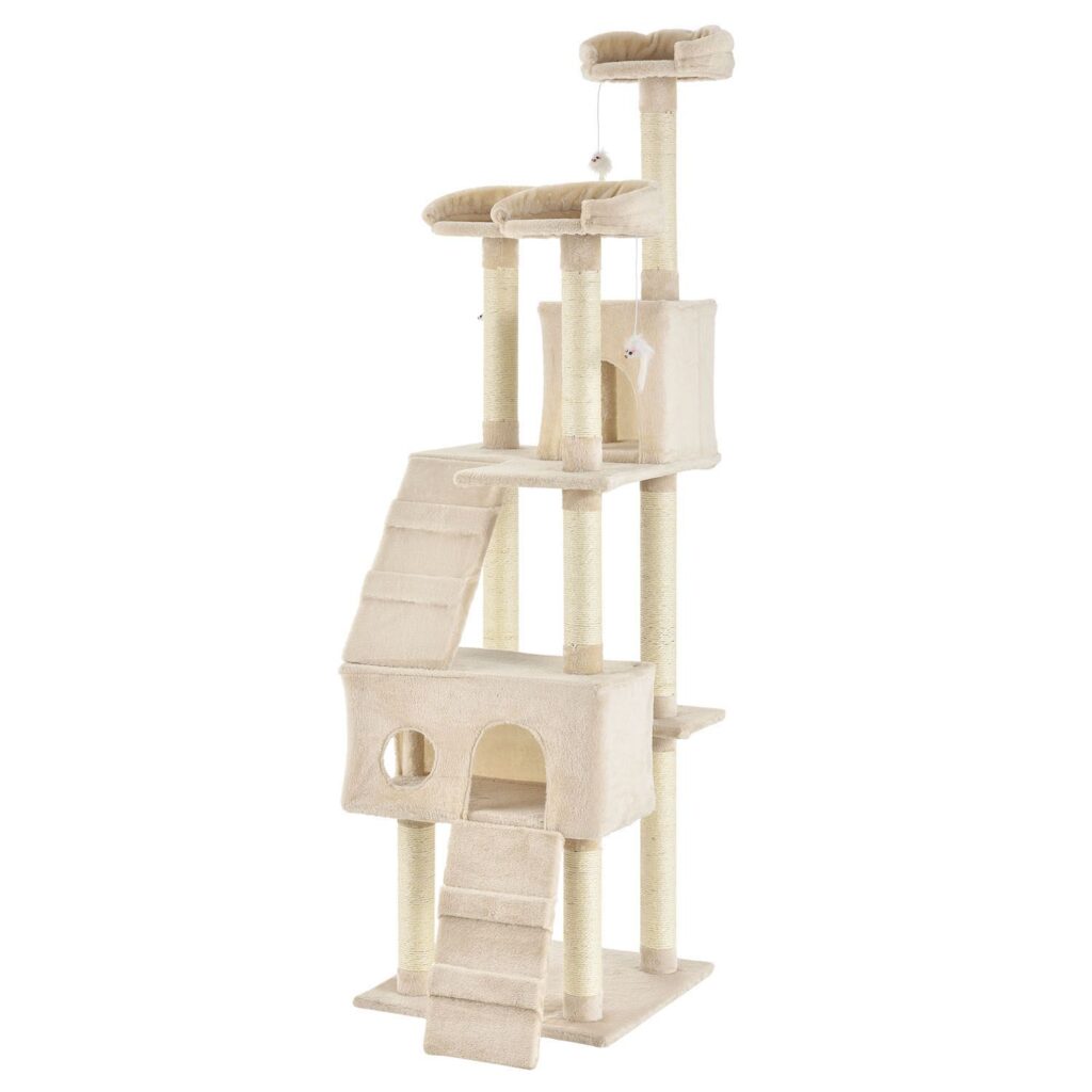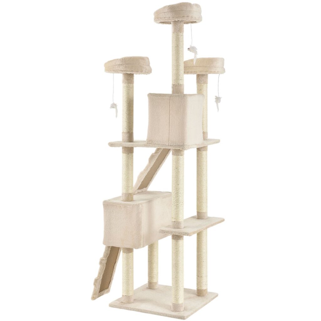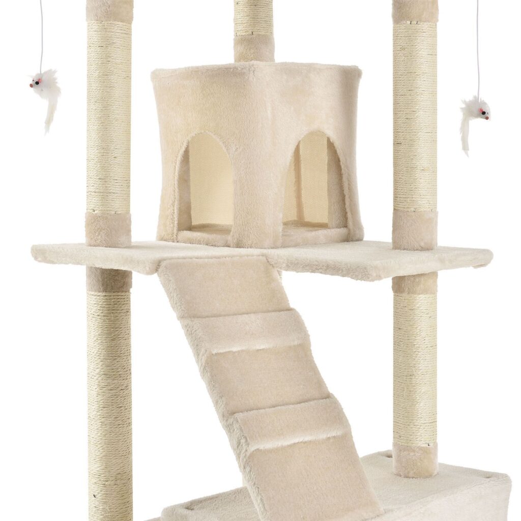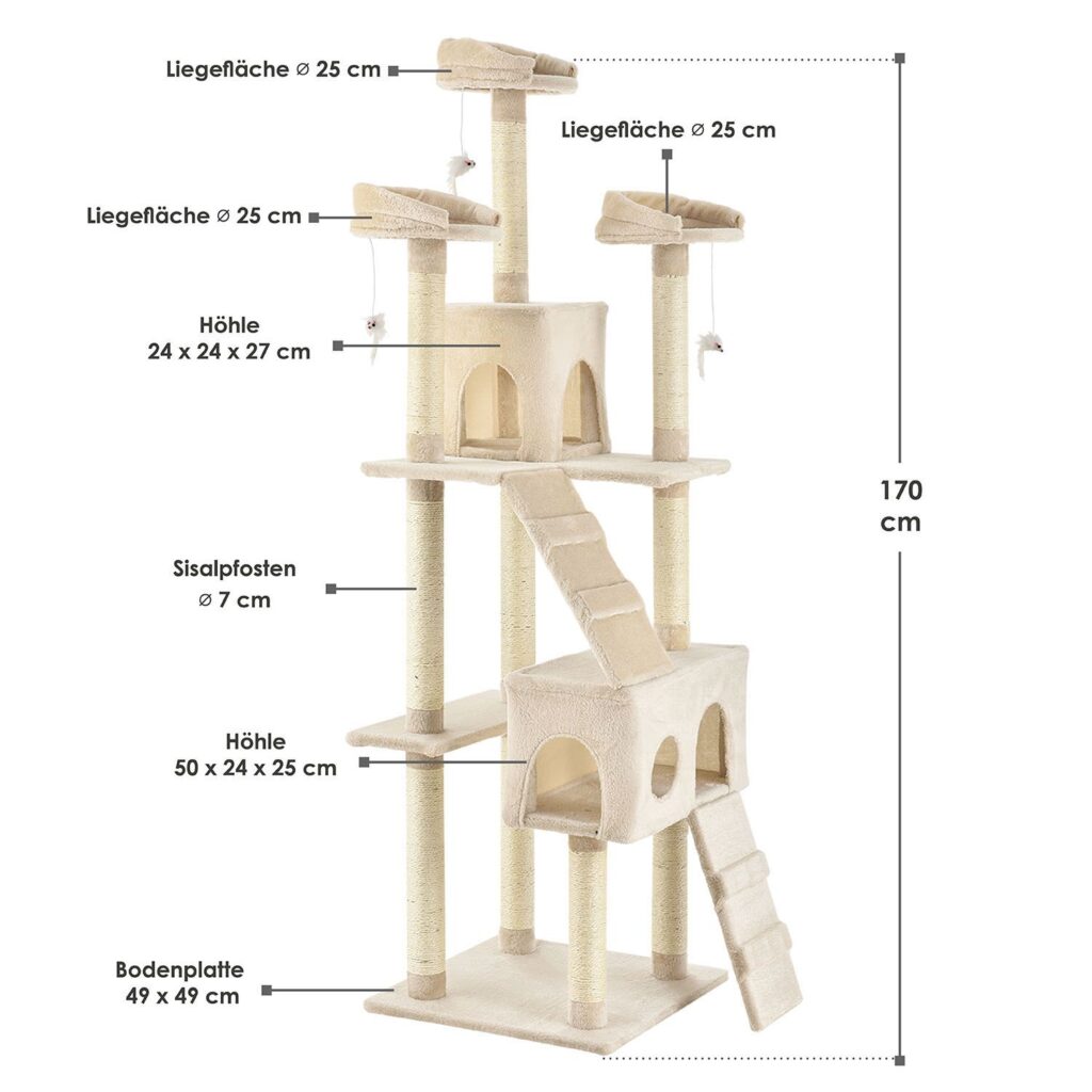 Кігтеточка Amy середньої висоти (бежева) змушує котячі серця битися швидше. Вона дає вашому улюбленому вихованцю численні можливості грати, стрибати, відпочивати та точити пазурі. Ваша кішка почуватиметься абсолютно комфортно і із задоволенням усамітниться на котячому дереві. Завдяки своїй компактній конструкції кігтеточка висотою 170 см займає мало місця і її можна встановити навіть у невеликих квартирах. Це робить котяче дерево вигідним вкладенням для кожного власника кішки.