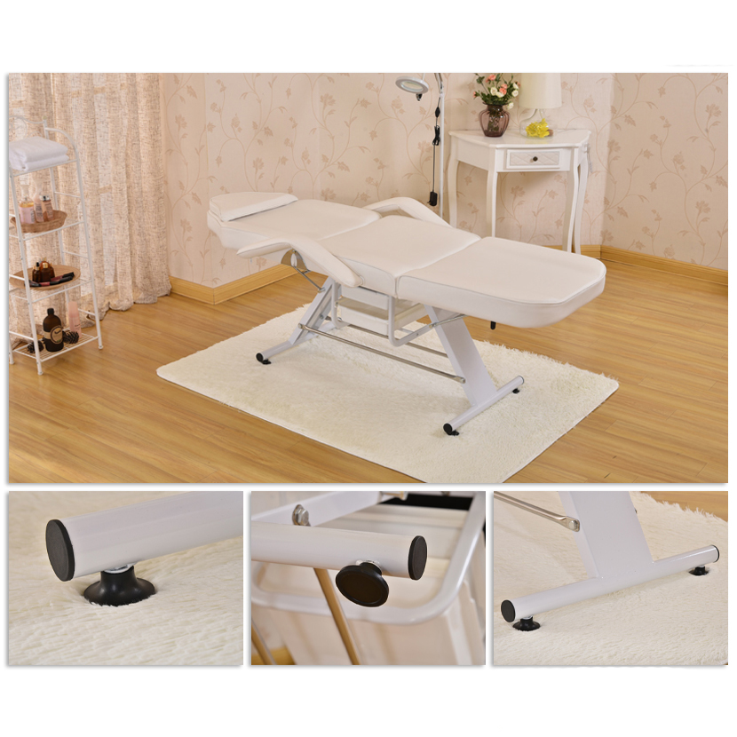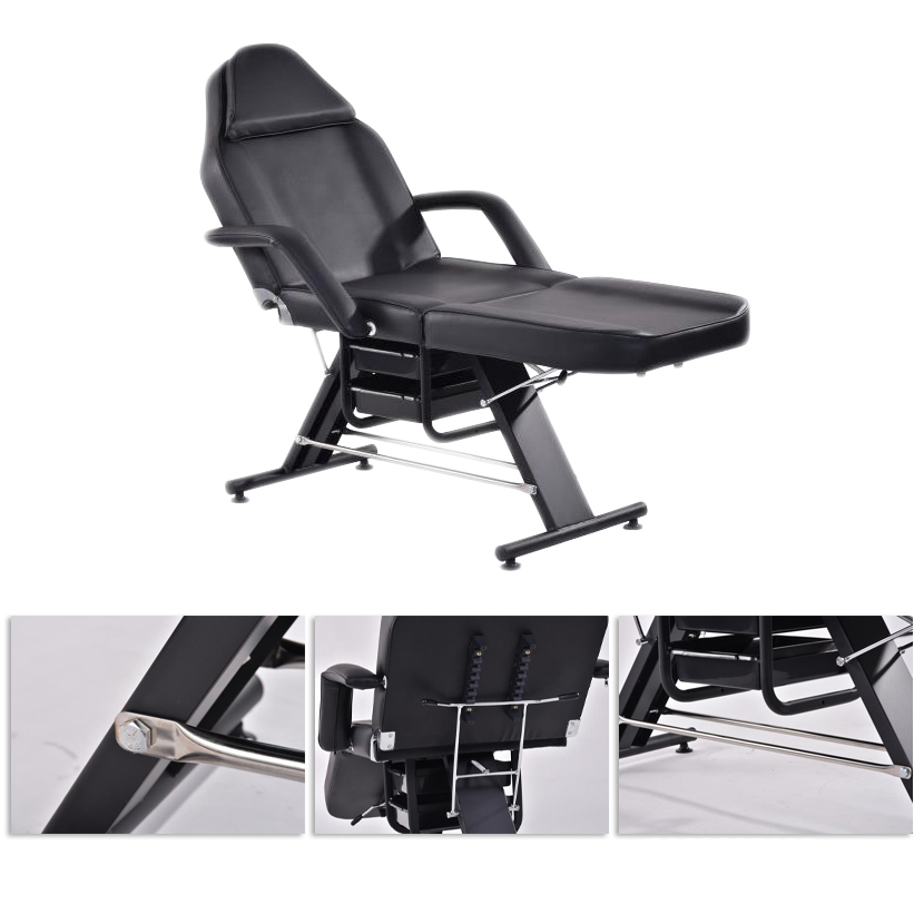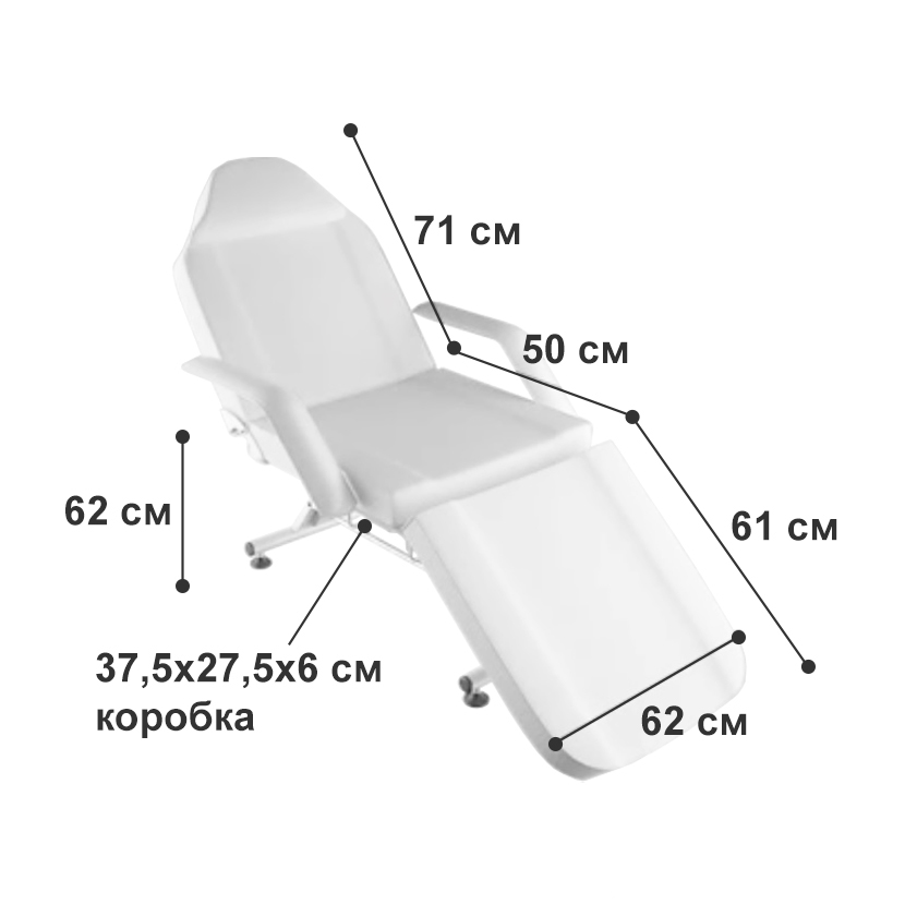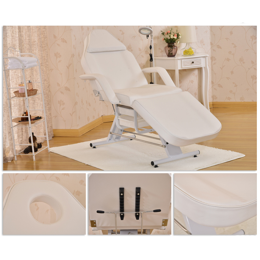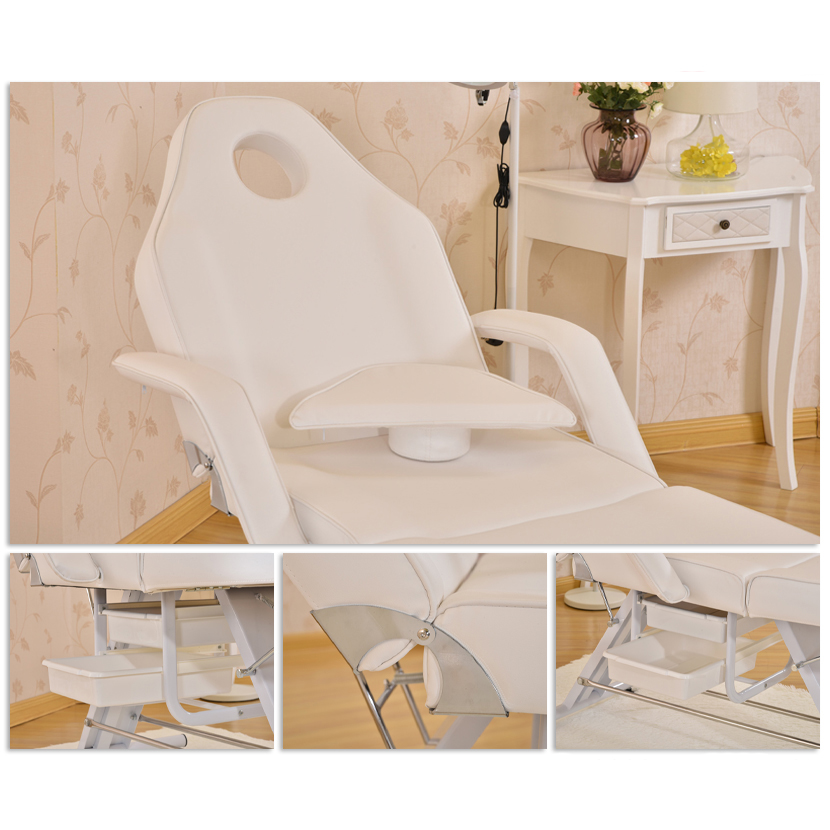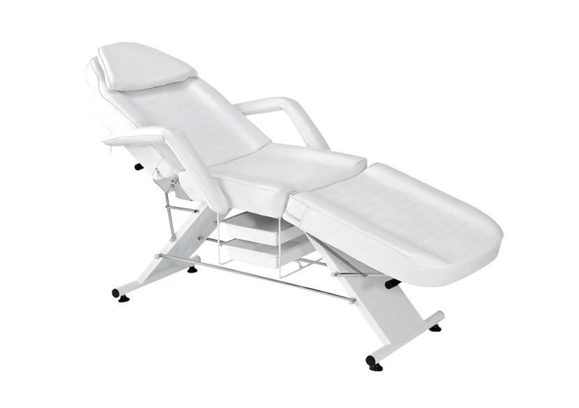 Крісло з отвором у підголівнику, з практичними кюветами, ідеально підходить для косметики, візажу та масажу. Має знімні підлокітники та заглушку у підголовнику. Чохол на сидінні легко миється, виготовлений з еко-шкіри, відповідає суворим вимогам ЄС, естетичний, нікельований металевими елементами.