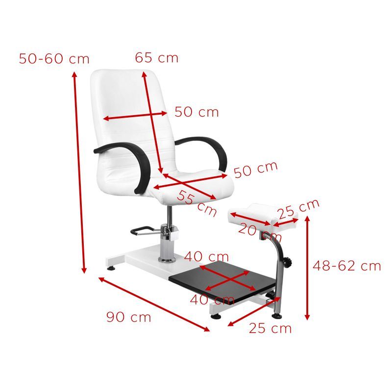Крісло, що піднімається і опускається гідравлічно, ідеально підходить для роботи з педикюром. Поворотне із замком, з ручним регулюванням висоти, підставки для ніг та підставкою для ванни. Чохол крісла легко миється, виготовлений із екошкіри, відповідає суворим вимогам ЄС. Крісло доступне в білому з чорними підлокітниками та підставкою під ванну.