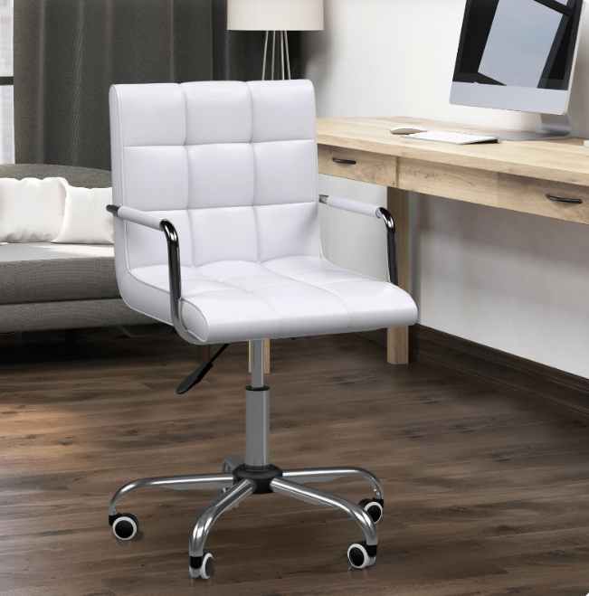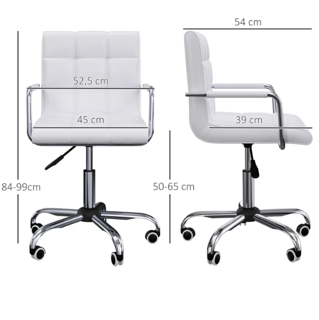 Наше крісло, що обертається, HOMCOM характеризується ексклюзивним дизайном у поєднанні з високою придатністю для щоденного використання. Красивий білий чохол із штучної шкіри покриває зручну оббивку. Завдяки підлокітникам та регулюванню висоти ви завжди сидите дійсно комфортно. Ваш настільний стілець просто виділяється в офісі, домашньому офісі або у вашому житловому приміщенні. Розставте акценти із новим робочим стільцем.