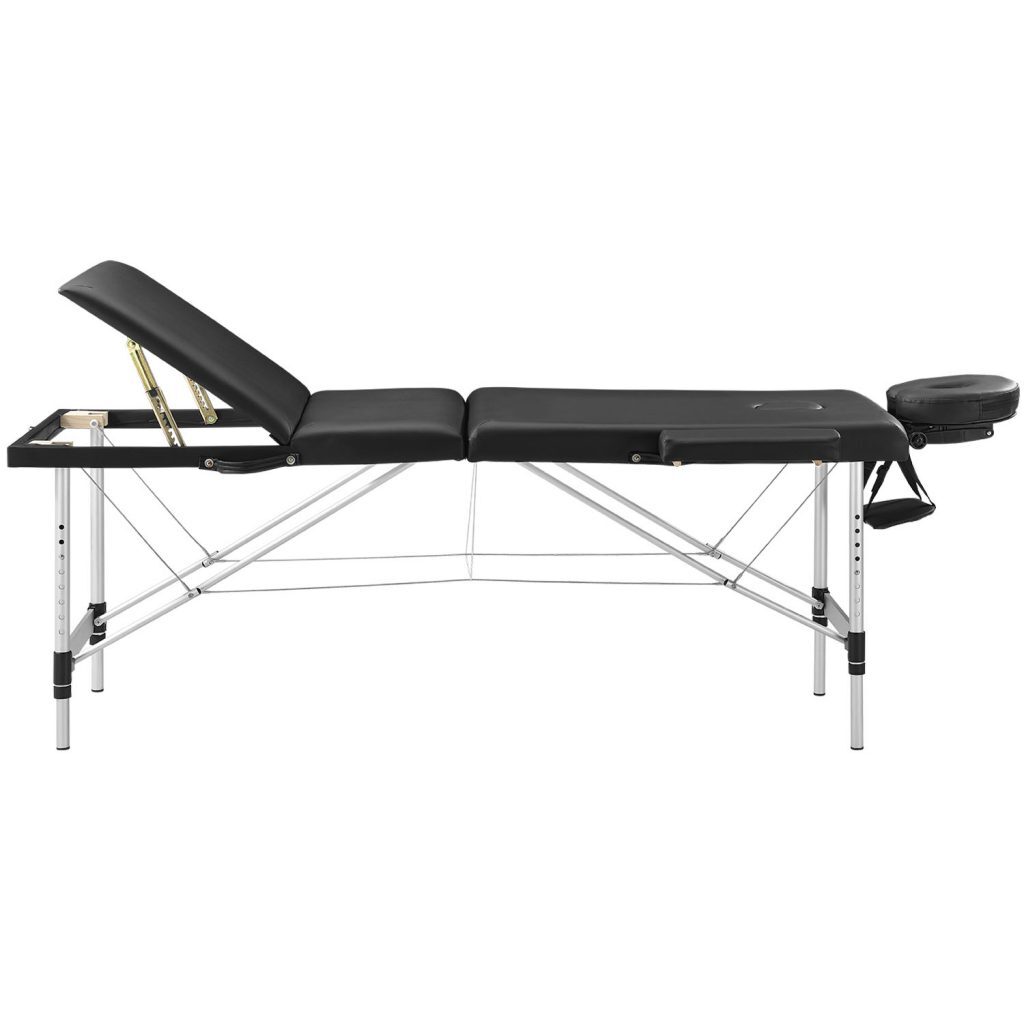 Масажний стіл розміром 180×60 см складається з міцного алюмінієвого каркаса та зручної оббивки зі шкіри (чорного кольору), з поглибленням для обличчя, підголовником, підлокітником.