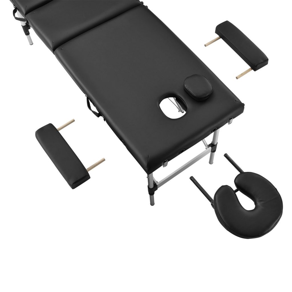 Масажний стіл розміром 180×60 см складається з міцного алюмінієвого каркасу та зручної оббивки зі шкіри (чорного кольору), з поглибленням для обличчя, підголовником, підлокітниками та ножною секцією.
