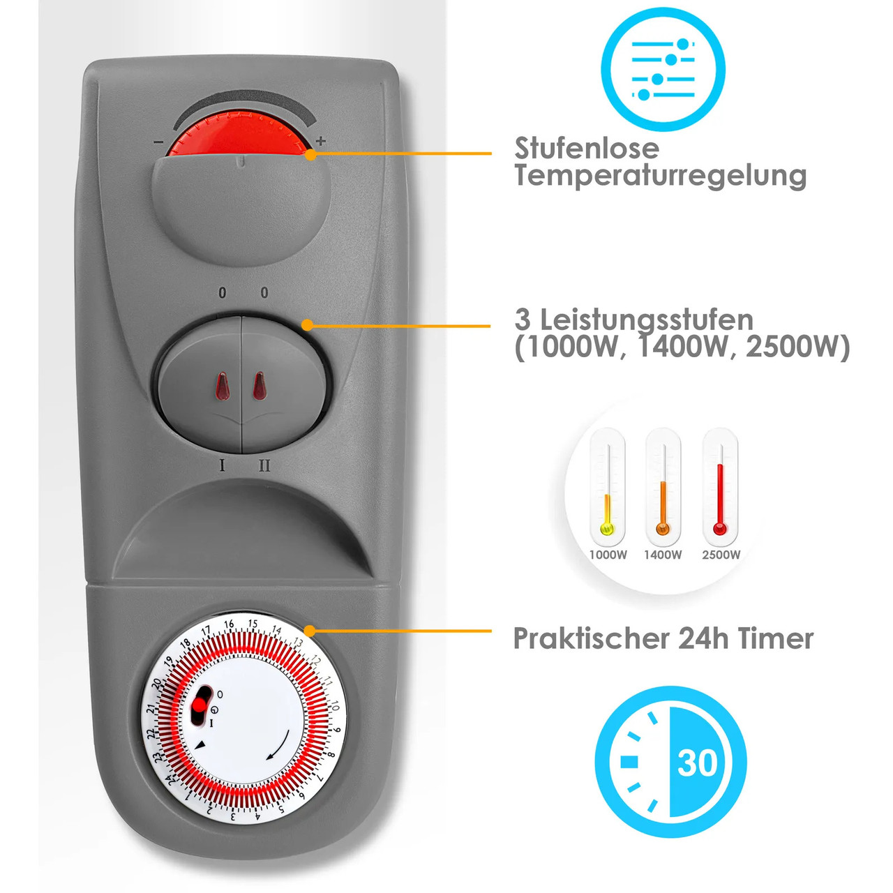 ✔ Стриманий і зручний у використанні дизайнОбігрівач широкого спектра використання. Можна використовувати у будинку, гаражі, майстерні чи саду: завдяки своєму стриманому дизайну обігрівач вписується в будь-який інтер’єр і є практичним джерелом тепла. Два перемикача з трьома рівнями нагріву (1000 Вт/1400 Вт/2500 Вт) і безступінчатий регулятор термостата разом із вбудованим робочим дисплеєм дозволяють швидко та легко регулювати бажану потужність нагріву.