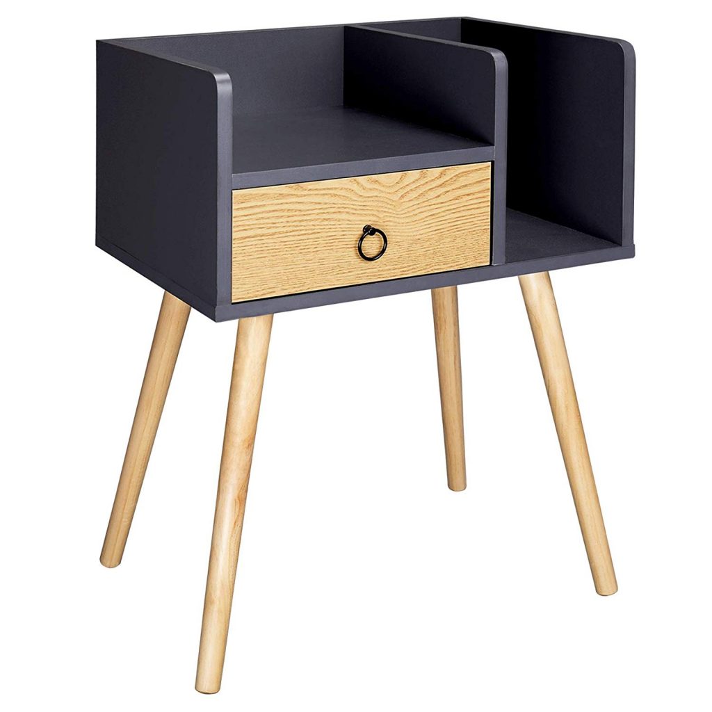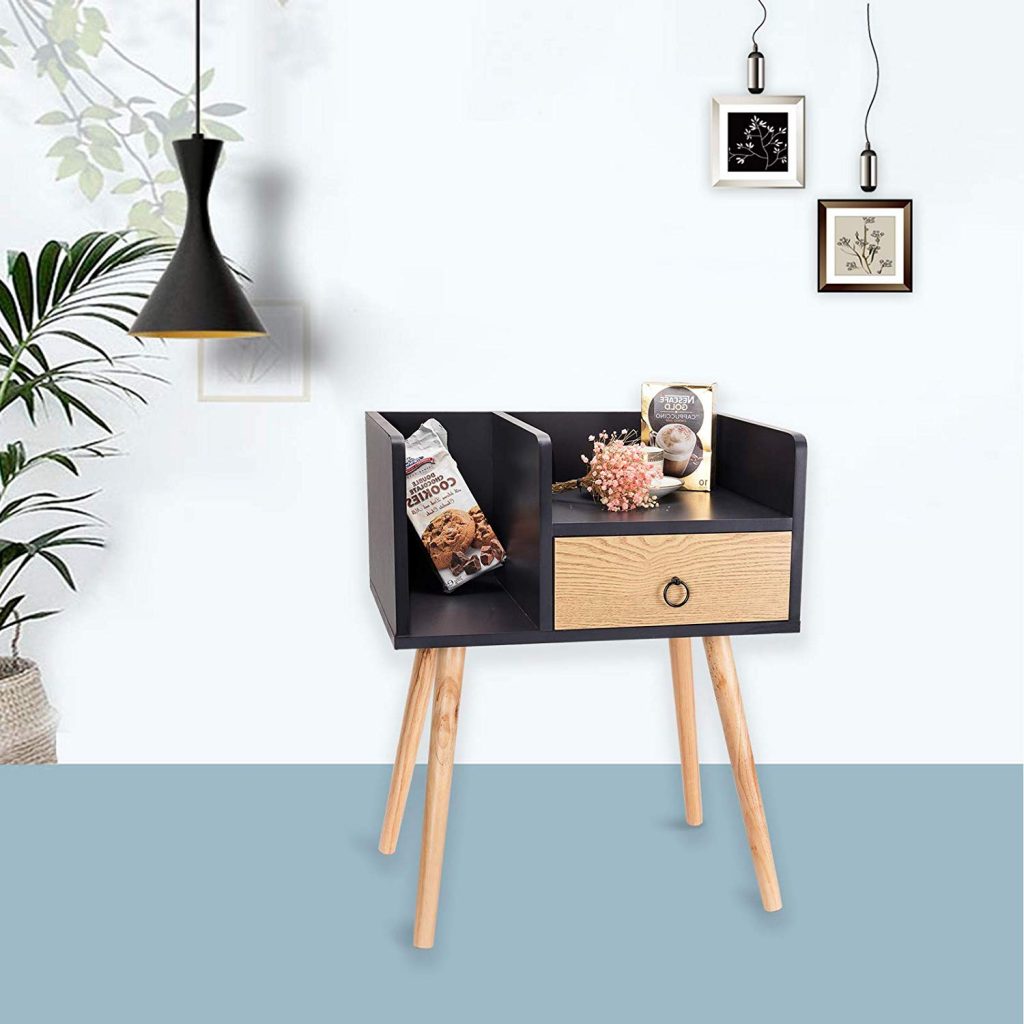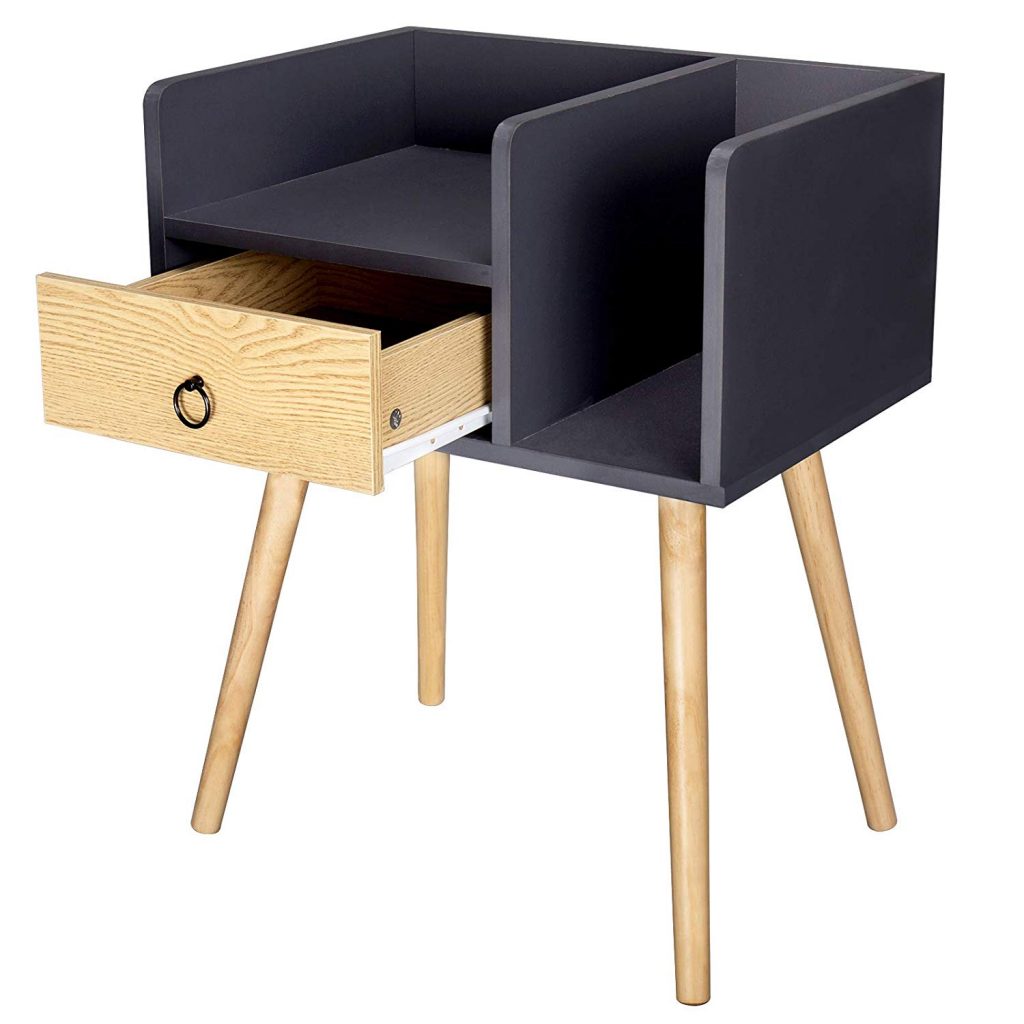• Тумбочка з висувною скринькою та відкритим відсіком, де можна зберігати книги, журнали