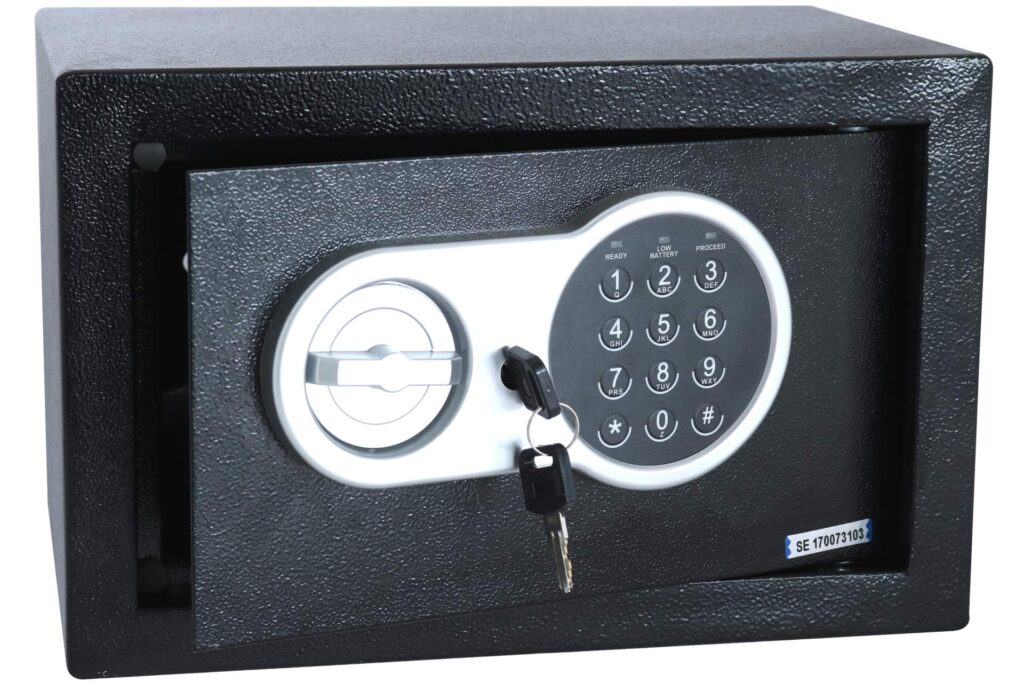 Цей електронний сейф, виготовлений із міцного металу, ідеально підходить для безпечного зберігання коштовностей, грошей тощо.