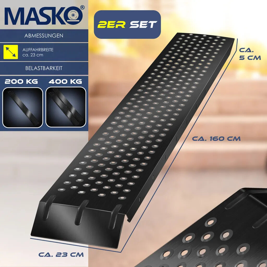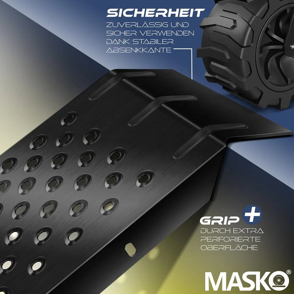 KO Набір панду сталева конструкція для багатьох сфер застосування, високий рівень безпеки завдяки верхньому упору та неслизькій поверхні, простий у використанні для легкого завантаження. Наш набір під'їзних рамп MASKO із 2 шт. - Ідеальне рішення для тих, кому часто доводиться вантажити важкі предмети. Рампа виготовлена з високоякісної та стійкої сталевої конструкції, яка гарантує безпечне та стабільне завантаження вашого вантажу. Завдяки верхньому упору для надійного стикування та неслизької перфорованої поверхні, завантажувати важкі предмети безпечно та легко.