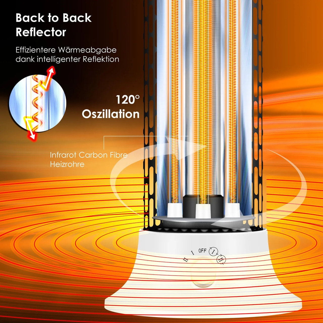 Завдяки інтегрованим і екологічно чистим нагрівальним трубкам з вуглецевого волокна до 90% енергії перетворюється на тепло, не створюючи відблисків. Крім того, баштовий нагрівач випромінює на навколишні тіла, поверхні та предмети та забезпечує миттєвий розвиток тепла протягом 30 секунд. Це має велику перевагу, оскільки тепло може ефективно розподілятися навіть у вітряну та холодну погоду. Радіаційно-ефективна конструкція завдяки інтелектуальному рефлектору «спина до спини» забезпечує найкращий розвиток тепла. Не витрачайте енергію, налаштуйте нагрівач індивідуально, щоб не втратити тепло. Завдяки надзвичайно тихому рівню шуму інфрачервоний обігрівач можна використовувати будь-де. Поки ви спите або розмовляєте з друзями в саду, ви можете залишити пристрій увімкненим, щоб вас не турбували.