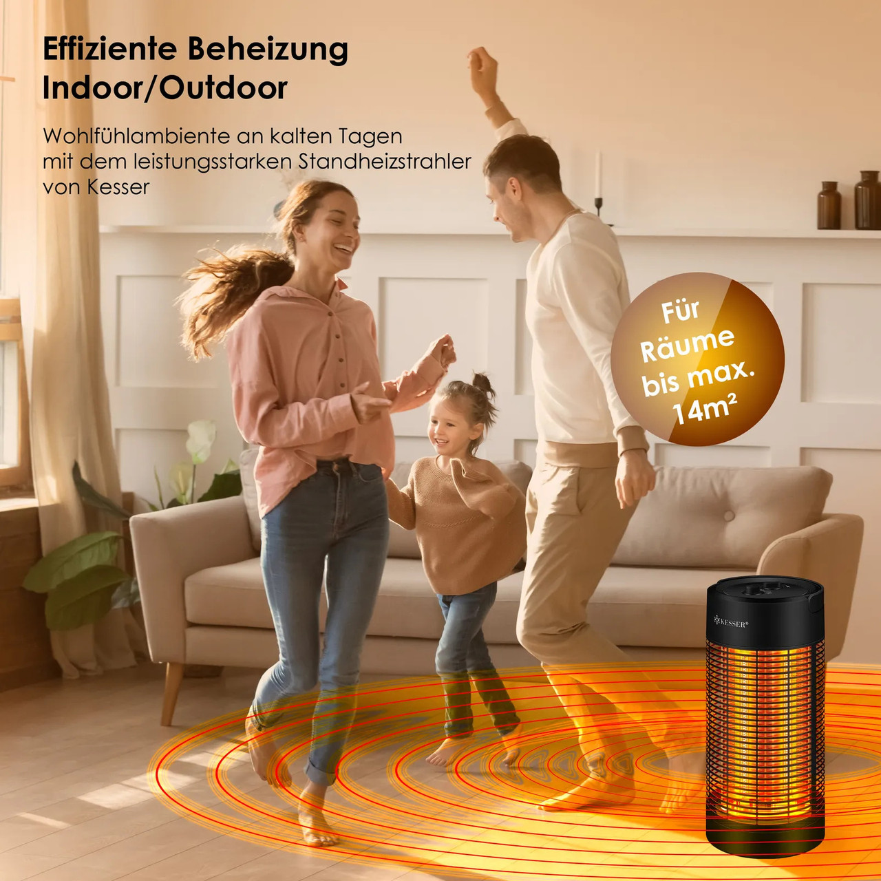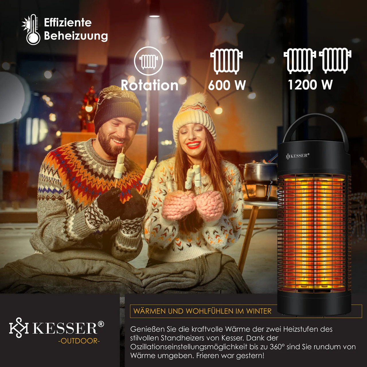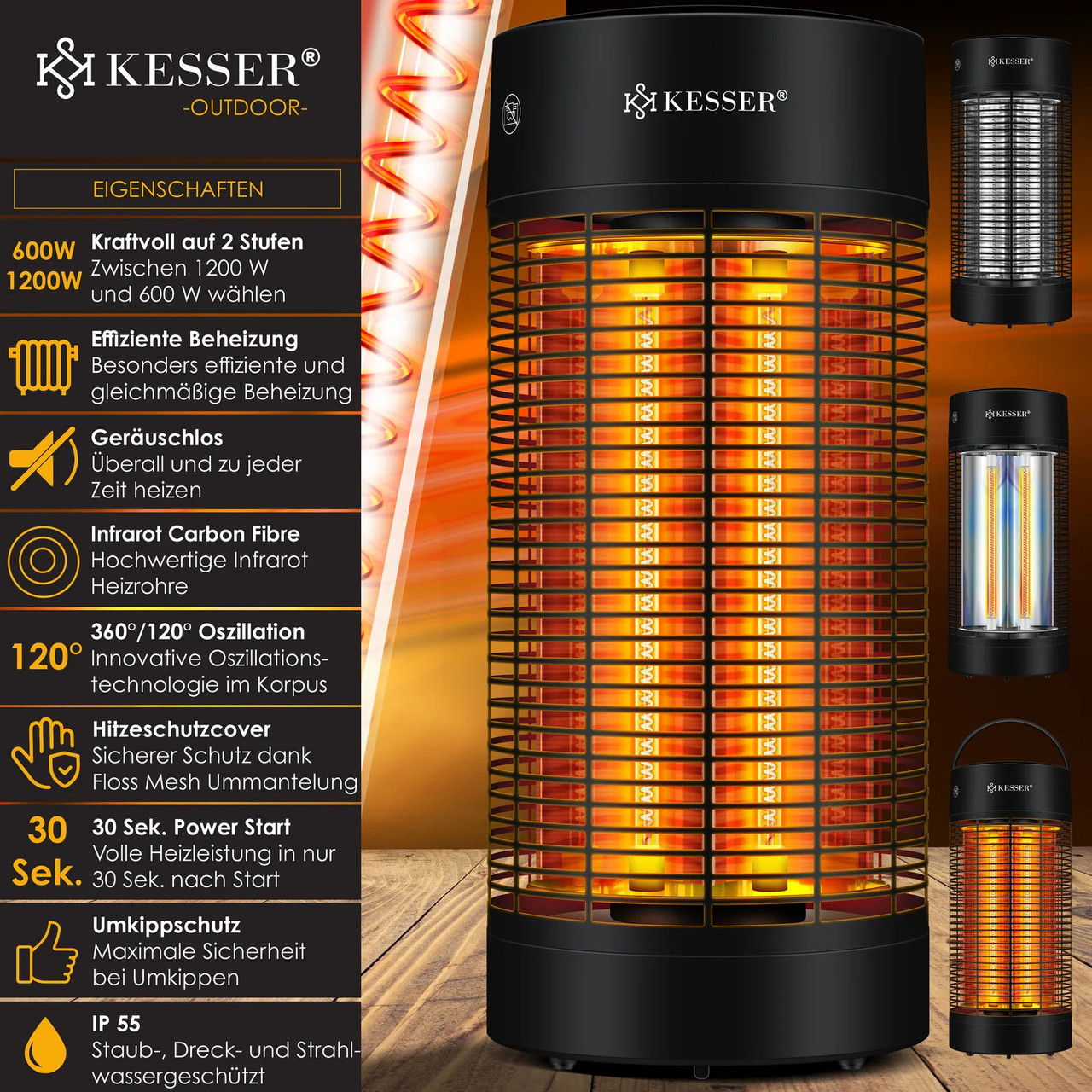 Обігрівач KESSER з двома потужними рівнями для ефективного та рівномірного нагріву завдяки високоякісним інфрачервоним нагрівальним трубкам, безшумним коливанням 120°-360°, теплозахисним кожухом, повною потужністю нагріву всього за 30 секунд, захистом від перекидання та захистом IP 55.